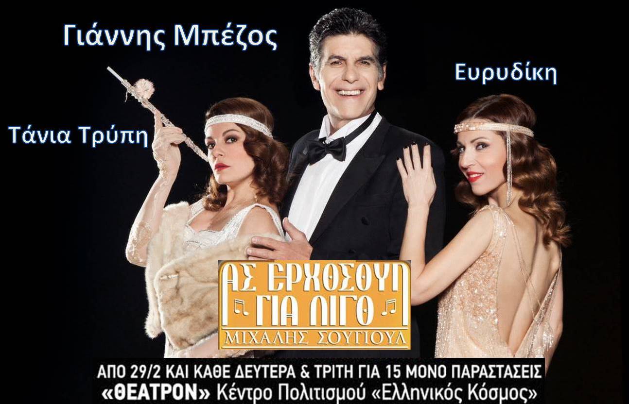 Προσφορά ΗAPPYDEALS: Ας ερχόσουν για λίγο: Από 10€ για είσοδο 1 ατόμου σε μια μουσικοθεατρική υπερπαραγωγή, στο Κέντρο Πολιτισμού "Ελληνικός Κόσμος", με τους Γιάννη Μπέζο, Τάνια Τρύπη, Ευρυδίκη κα!